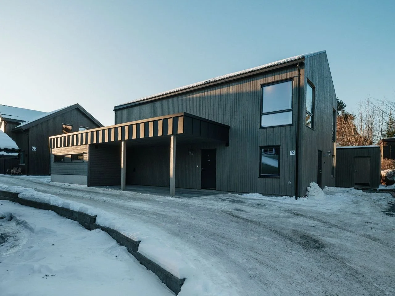 Tilbygg til enebolig fra 2023. Bygget har flere funksjoner - carport, verktøy-/sportsbod og inngangsparti, i tillegg til at det bryter opp en massiv og monoton veggflate.